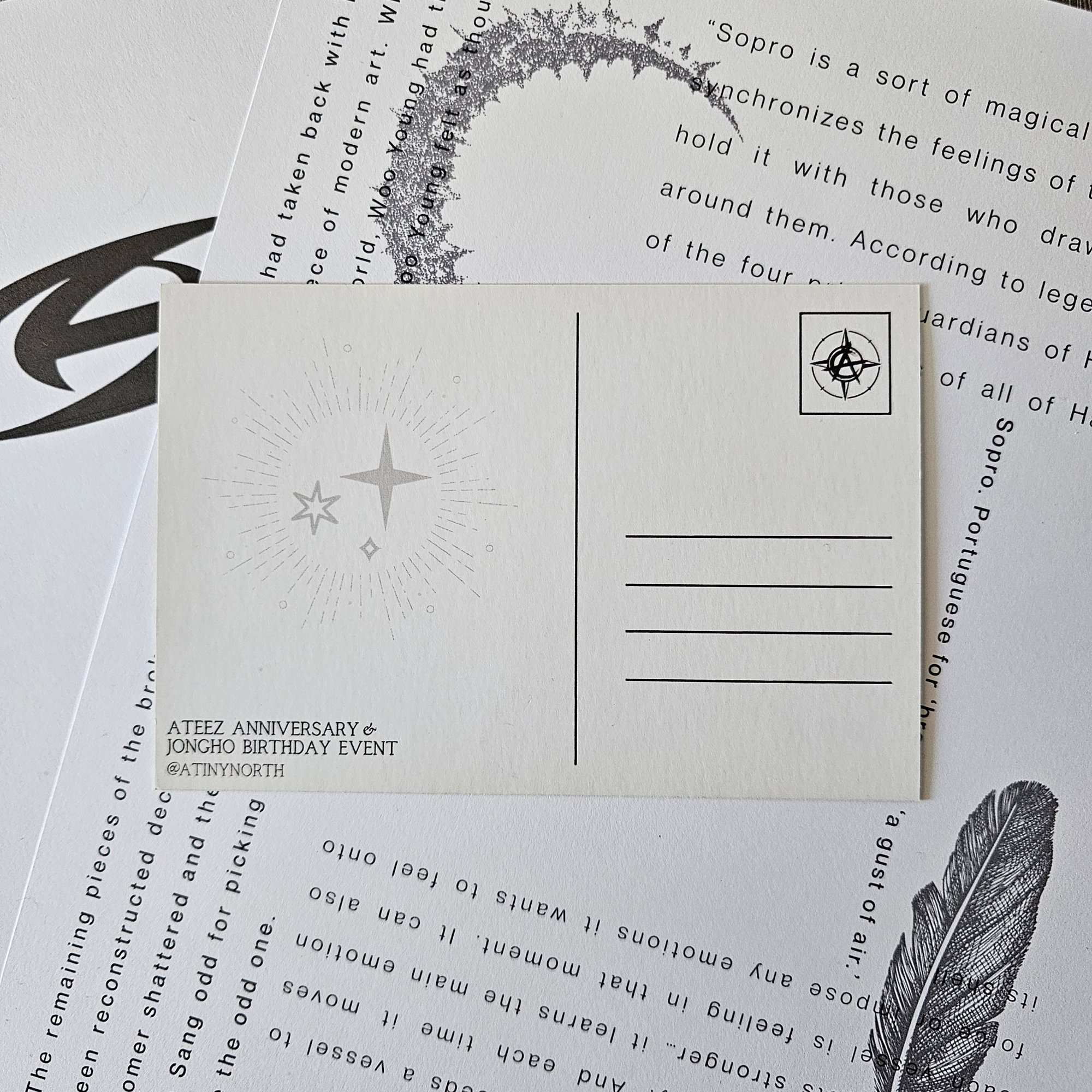 Double-sided 4in x 6in postcard inspired by the ATEEZ Fairytale 4 year anniversary membership kit. The design is set from ATINY’s view & features a full moon, the Cromer ATEEZ uses to travel through dimensions & time, & a member group photo.