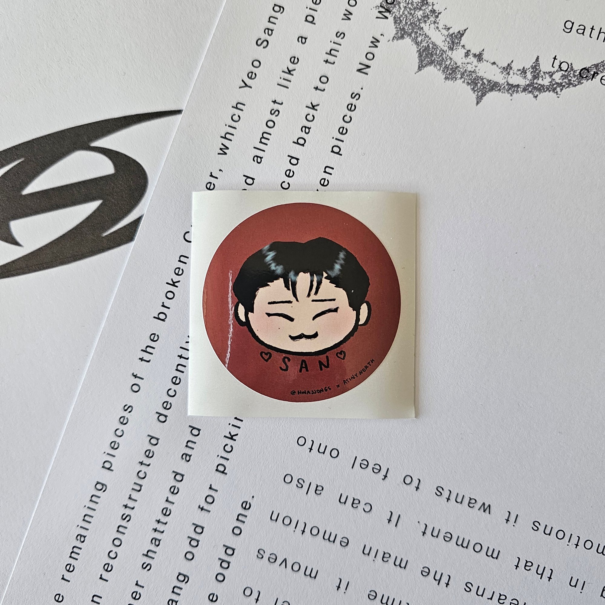 San circle Sticker from our SanSangGi Concert Meetup event (themed after the music video for ATEEZ’s title track song ‘WORK’ from their album “GOLDEN HOUR : Part.1”). San is designed with his black hairstyle. (2in x 2in)