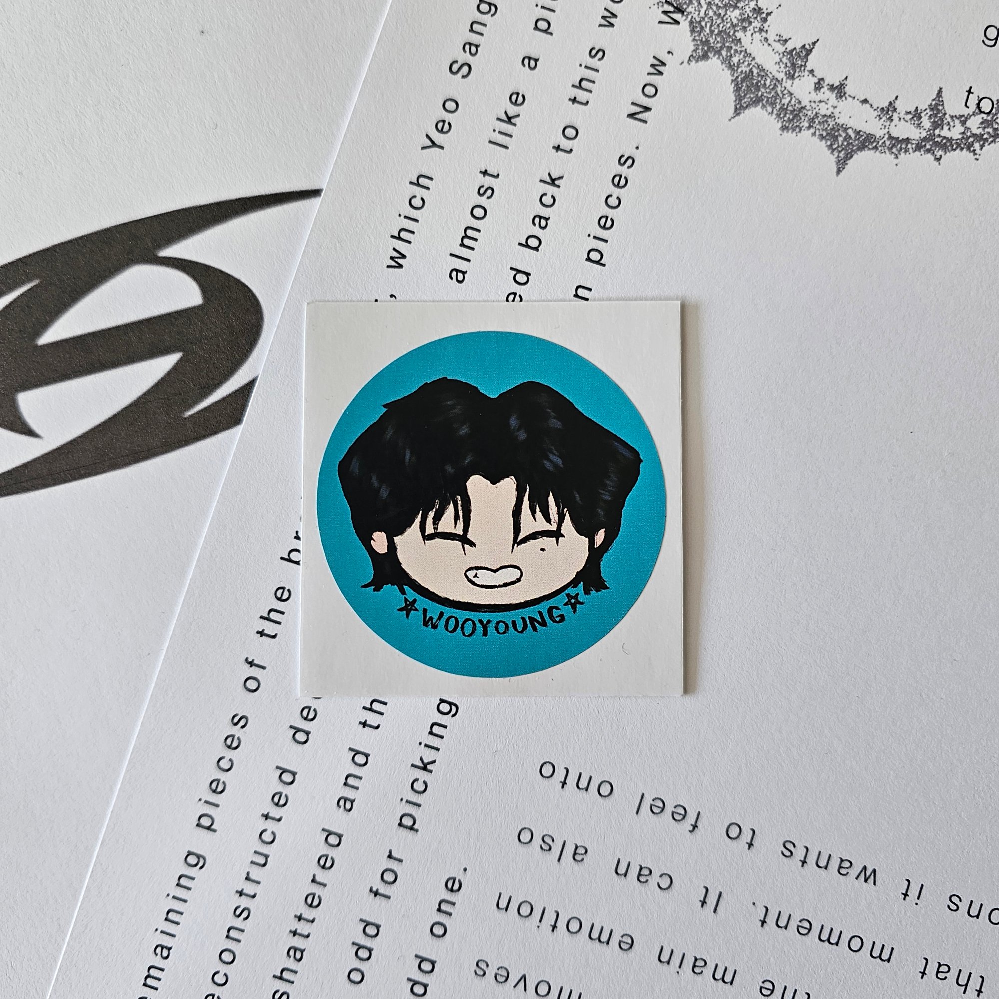 Wooyoung circle Sticker from our Topaz : WILL event (themed after ATEEZ’s comeback & album for “THE WORLD EP.FIN : WILL”). Wooyoung is designed with his long dark hairstyle & bangs. (2in x 2in)